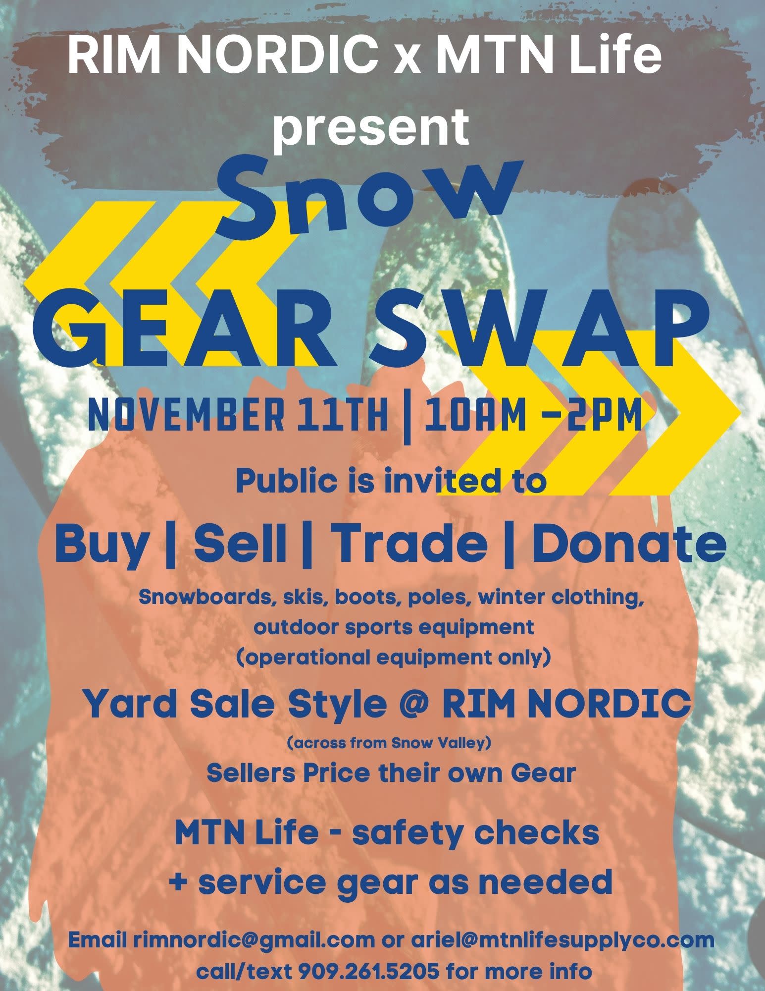 Snowboards, skis, boots, poles, winter clothing, outdoor sports equipment (operational equipment only). Sellers price their own Gear. Yard Sale Style Event at Rim Nordic Ski Area across from Snow Valley Ski Resort.