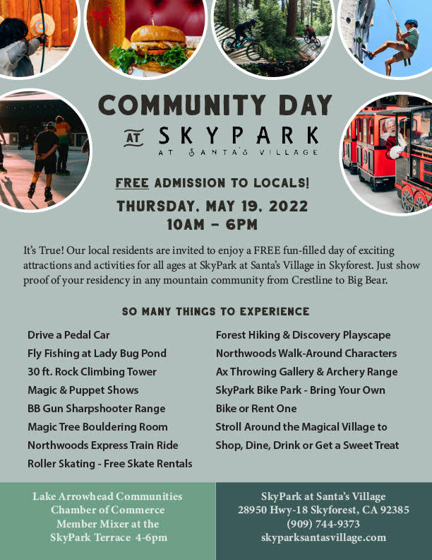 FREE ADMISSION to Locals! Our local residents are invited to enjoy a FREE fun-filled day of exciting attractions and activities for all ages at SkyPark at Santa's Village in Skyforest. Just show proof of your residency in any mountain community from Crestline to Big Bear.Images